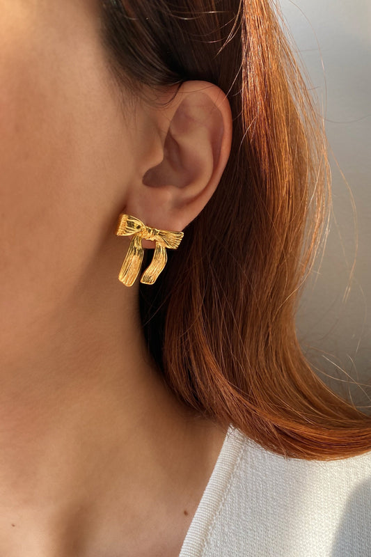 Add a touch of charm and sophistication to your jewellery collection with our Bow Stud Earrings. Crafted from durable stainless steel and coated with a radiant gold plating, these earrings feature a delicate bow design that exudes elegance and femininity.